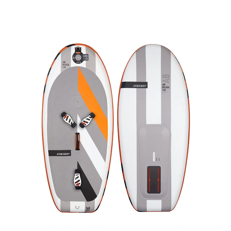 The super light and rigid carbon plate on the bottom with a specific trapezoidal outline gives a feeling of control in flight equal to a composite board. The Air Beluga is a light inflatable board using two stripes of PVC fabric on top and bottom to increase stiffness and a lightweight dropstitch body.